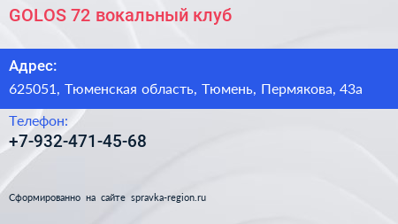 GOLOS 72, вокальный клуб по адресу 625051, Тюменская область, Тюмень, Пермякова, 43а в дальнейшем Организация, размещена в следующих категориях: