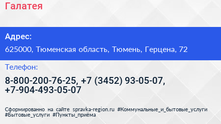 Галатея по адресу 625000, Тюменская область, Тюмень, Герцена, 72 в дальнейшем Организация, размещена в следующих категориях: