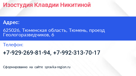 Изостудия Клавдии Никитиной по адресу 625026, Тюменская область, Тюмень, проезд Геологоразведчиков, 6 в дальнейшем Организация, размещена в следующих категориях: