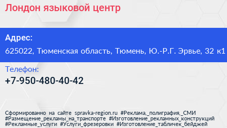 Лондон, языковой центр по адресу 625022, Тюменская область, Тюмень, Ю.-Р.Г. Эрвье, 32 к1 в дальнейшем Организация, размещена в следующих категориях: