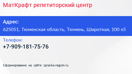 МатКрафт, репетиторский центр по адресу 625051, Тюменская область, Тюмень, Широтная, 100 к5 в дальнейшем Организация, размещена в следующих категориях: