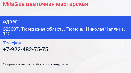 MilaGus, цветочная мастерская по адресу 625007, Тюменская область, Тюмень, Николая Чаплина, 113 в дальнейшем Организация, размещена в следующих категориях: