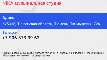 NIKA, музыкальная студия по адресу 625026, Тюменская область, Тюмень, Таймырская, 72а в дальнейшем Организация, размещена в следующих категориях: