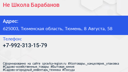 Не Школа Барабанов по адресу 625003, Тюменская область, Тюмень, 8 Августа, 58 в дальнейшем Организация, размещена в следующих категориях: