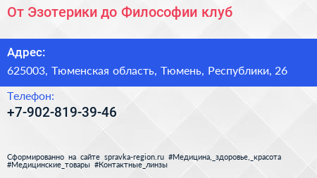 От Эзотерики до Философии, клуб по адресу 625003, Тюменская область, Тюмень, Республики, 26 в дальнейшем Организация, размещена в следующих категориях: