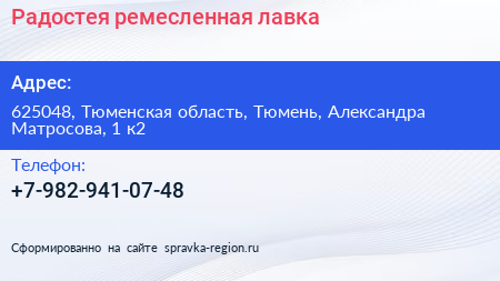 Радостея, ремесленная лавка по адресу 625048, Тюменская область, Тюмень, Александра Матросова, 1 к2 в дальнейшем Организация, размещена в следующих категориях: