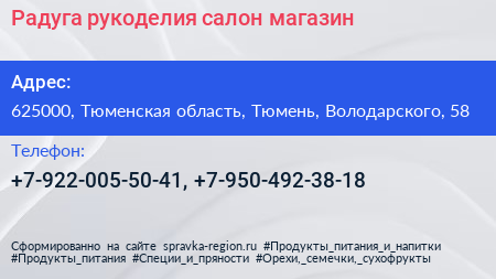 Радуга рукоделия, салон-магазин по адресу 625000, Тюменская область, Тюмень, Володарского, 58 в дальнейшем Организация, размещена в следующих категориях: