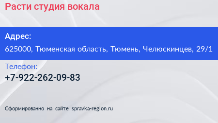 Расти, студия вокала по адресу 625000, Тюменская область, Тюмень, Челюскинцев, 29/1 в дальнейшем Организация, размещена в следующих категориях: