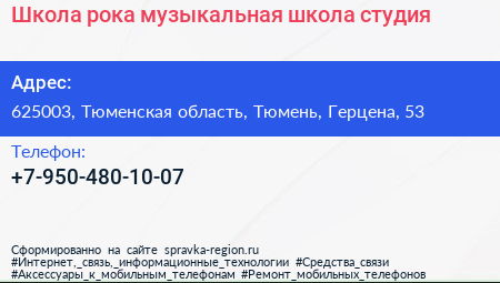 Школа рока, музыкальная школа-студия по адресу 625003, Тюменская область, Тюмень, Герцена, 53 в дальнейшем Организация, размещена в следующих категориях: