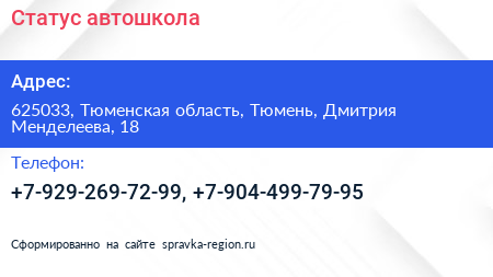 Статус, автошкола по адресу 625033, Тюменская область, Тюмень, Дмитрия Менделеева, 18 в дальнейшем Организация, размещена в следующих категориях: