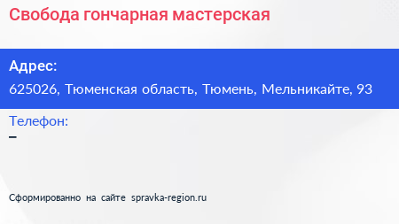 Свобода, гончарная мастерская по адресу 625026, Тюменская область, Тюмень, Мельникайте, 93 в дальнейшем Организация, размещена в следующих категориях: