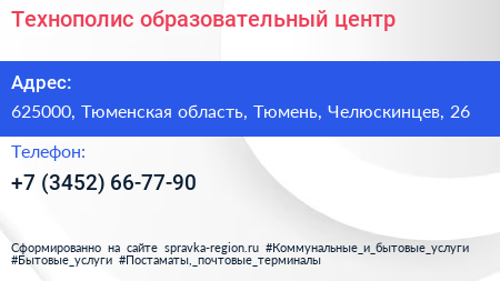 Технополис, образовательный центр по адресу 625000, Тюменская область, Тюмень, Челюскинцев, 26 в дальнейшем Организация, размещена в следующих категориях: