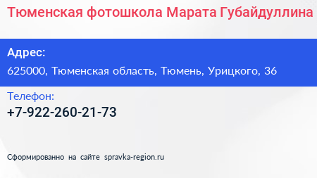 Тюменская фотошкола Марата Губайдуллина по адресу 625000, Тюменская область, Тюмень, Урицкого, 36 в дальнейшем Организация, размещена в следующих категориях: