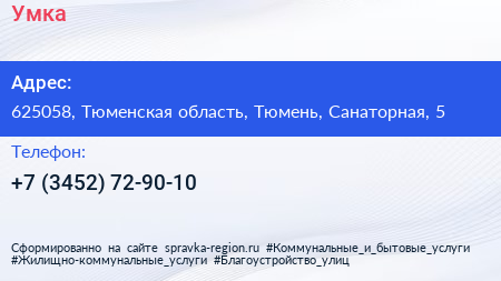 Умка по адресу 625058, Тюменская область, Тюмень, Санаторная, 5 в дальнейшем Организация, размещена в следующих категориях: