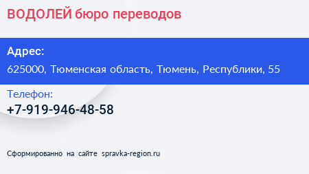 ВОДОЛЕЙ, бюро переводов по адресу 625000, Тюменская область, Тюмень, Республики, 55 в дальнейшем Организация, размещена в следующих категориях: