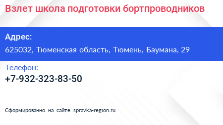Взлет, школа подготовки бортпроводников по адресу 625032, Тюменская область, Тюмень, Баумана, 29 в дальнейшем Организация, размещена в следующих категориях: