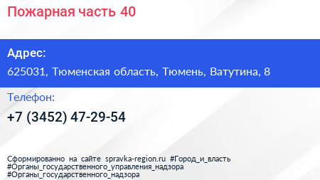 Пожарная часть №40 по адресу 625031, Тюменская область, Тюмень, Ватутина, 8 в дальнейшем Организация, размещена в следующих категориях: