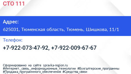 СТО 111 по адресу 625031, Тюменская область, Тюмень, Шишкова, 11/1 в дальнейшем Организация, размещена в следующих категориях: