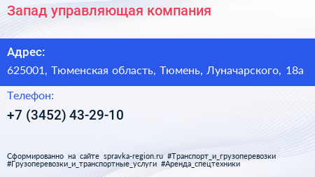 Запад, управляющая компания по адресу 625001, Тюменская область, Тюмень, Луначарского, 18а в дальнейшем Организация, размещена в следующих категориях: