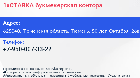 1xСТАВКА, букмекерская контора по адресу 625048, Тюменская область, Тюмень, 50 лет Октября, 26в в дальнейшем Организация, размещена в следующих категориях: