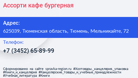 Ассорти, кафе-бургерная по адресу 625039, Тюменская область, Тюмень, Мельникайте, 72 в дальнейшем Организация, размещена в следующих категориях: