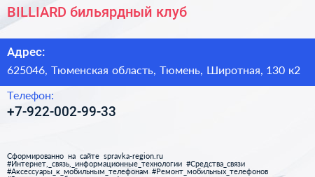 BILLIARD, бильярдный клуб по адресу 625046, Тюменская область, Тюмень, Широтная, 130 к2 в дальнейшем Организация, размещена в следующих категориях: