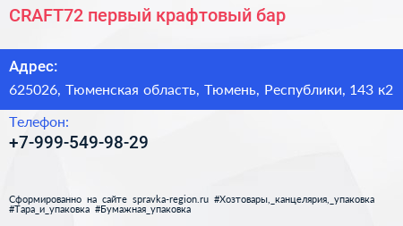 #CRAFT72, первый крафтовый бар по адресу 625026, Тюменская область, Тюмень, Республики, 143 к2 в дальнейшем Организация, размещена в следующих категориях: