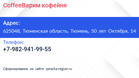 CoffeeВарим, кофейня по адресу 625048, Тюменская область, Тюмень, 50 лет Октября, 14 в дальнейшем Организация, размещена в следующих категориях: