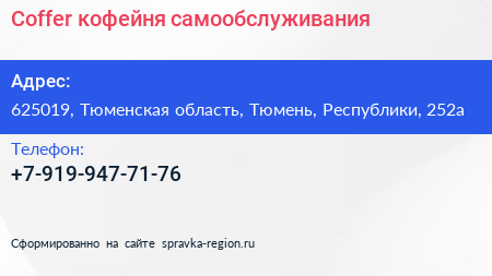 Coffer, кофейня самообслуживания по адресу 625019, Тюменская область, Тюмень, Республики, 252а в дальнейшем Организация, размещена в следующих категориях: