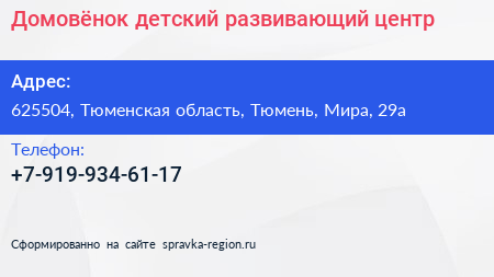 Домовёнок, детский развивающий центр по адресу 625504, Тюменская область, Тюмень, Мира, 29а в дальнейшем Организация, размещена в следующих категориях: