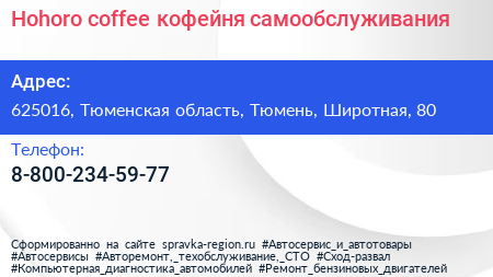 Hohoro сoffee, кофейня самообслуживания по адресу 625016, Тюменская область, Тюмень, Широтная, 80 в дальнейшем Организация, размещена в следующих категориях: