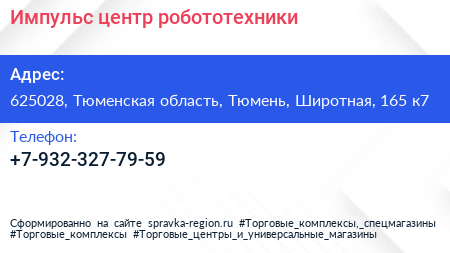 Импульс, центр робототехники по адресу 625028, Тюменская область, Тюмень, Широтная, 165 к7 в дальнейшем Организация, размещена в следующих категориях: