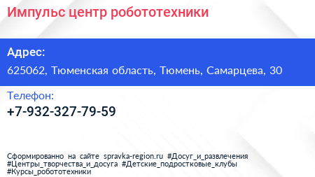 Импульс, центр робототехники по адресу 625062, Тюменская область, Тюмень, Самарцева, 30 в дальнейшем Организация, размещена в следующих категориях: