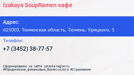 Izakaya SoupRamen, кафе по адресу 625003, Тюменская область, Тюмень, Урицкого, 5 в дальнейшем Организация, размещена в следующих категориях: