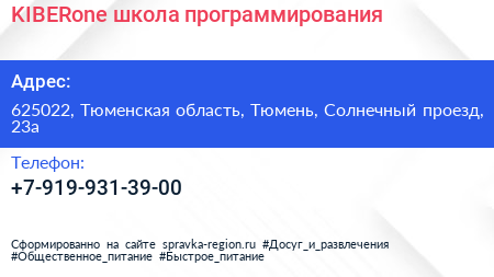 KIBERone, школа программирования по адресу 625022, Тюменская область, Тюмень, Солнечный проезд, 23а в дальнейшем Организация, размещена в следующих категориях: