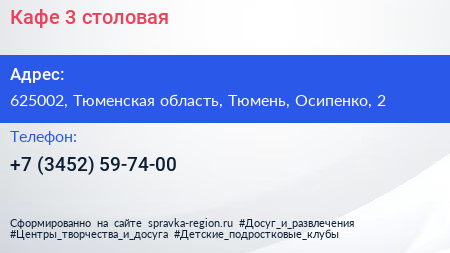Кафе №3, столовая по адресу 625002, Тюменская область, Тюмень, Осипенко, 2 в дальнейшем Организация, размещена в следующих категориях: