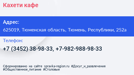 Кахети, кафе по адресу 625019, Тюменская область, Тюмень, Республики, 252а в дальнейшем Организация, размещена в следующих категориях: