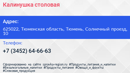 Калинушка, столовая по адресу 625022, Тюменская область, Тюмень, Солнечный проезд, 10 в дальнейшем Организация, размещена в следующих категориях: