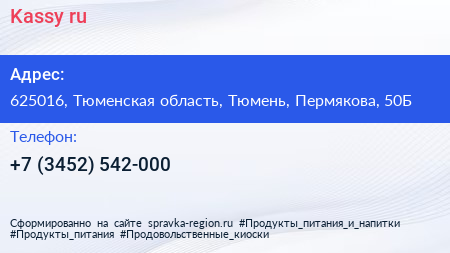 Kassy.ru по адресу 625016, Тюменская область, Тюмень, Пермякова, 50Б в дальнейшем Организация, размещена в следующих категориях:
