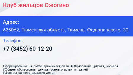 Клуб жильцов Ожогино по адресу 625062, Тюменская область, Тюмень, Федюнинского, 30 в дальнейшем Организация, размещена в следующих категориях: