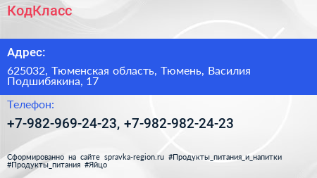 КодКласс по адресу 625032, Тюменская область, Тюмень, Василия Подшибякина, 17 в дальнейшем Организация, размещена в следующих категориях: