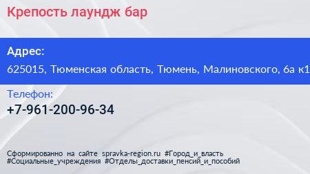 Крепость, лаундж-бар по адресу 625015, Тюменская область, Тюмень, Малиновского, 6а к1 в дальнейшем Организация, размещена в следующих категориях: