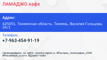 ЛАМАДЖО, кафе по адресу 625051, Тюменская область, Тюмень, Василия Гольцова, 34/1 в дальнейшем Организация, размещена в следующих категориях: