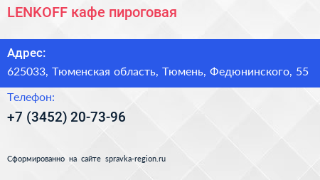 LENKOFF, кафе-пироговая по адресу 625033, Тюменская область, Тюмень, Федюнинского, 55 в дальнейшем Организация, размещена в следующих категориях: