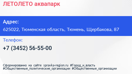 ЛЕТОЛЕТО, аквапарк по адресу 625022, Тюменская область, Тюмень, Щербакова, 87 в дальнейшем Организация, размещена в следующих категориях:
