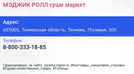МЭДЖИК РОЛЛ, суши-маркет по адресу 625001, Тюменская область, Тюмень, Полевая, 105 в дальнейшем Организация, размещена в следующих категориях: