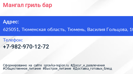 Мангал, гриль-бар по адресу 625051, Тюменская область, Тюмень, Василия Гольцова, 10 в дальнейшем Организация, размещена в следующих категориях: