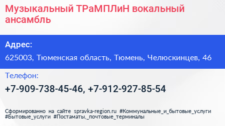 Музыкальный ТРаМПЛиН, вокальный ансамбль по адресу 625003, Тюменская область, Тюмень, Челюскинцев, 46 в дальнейшем Организация, размещена в следующих категориях: