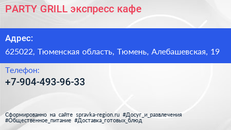 PARTY GRILL, экспресс-кафе по адресу 625022, Тюменская область, Тюмень, Алебашевская, 19 в дальнейшем Организация, размещена в следующих категориях: