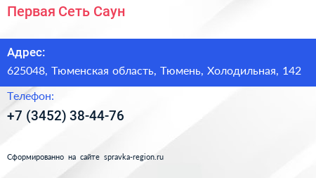 Первая Сеть Саун по адресу 625048, Тюменская область, Тюмень, Холодильная, 142 в дальнейшем Организация, размещена в следующих категориях: